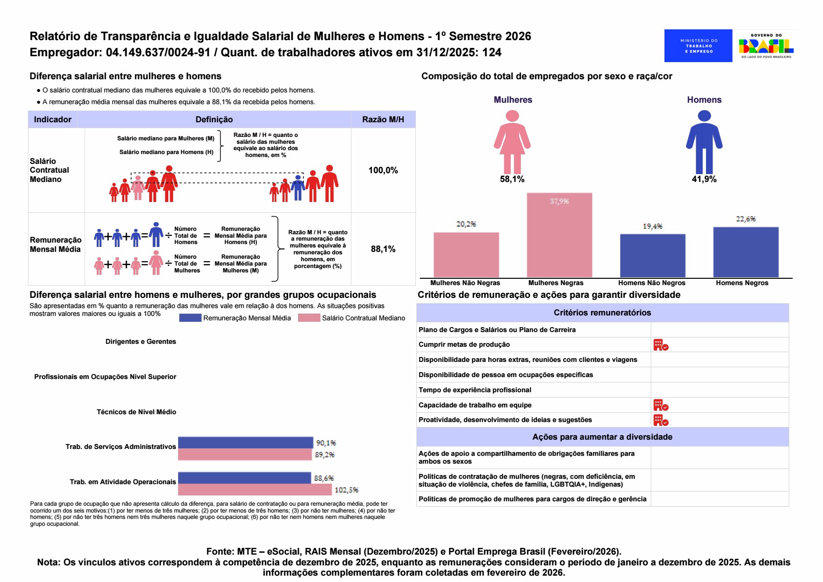 Em conformidade com essa legislação, o Grupo ABC divulga seu 1º ciclo de 2026 do Relatório de Transparência Salarial e de Critérios Remuneratórios. O material está organizado em documentos, abrangendo diversas localidades — como Alfenas, Araxá, Betim, Divinópolis, Guaxupé, Itajubá, Pouso Alegre, Uberaba e Varginha, entre outras — e apresenta as ações da empresa para assegurar equidade salarial e os critérios adotados para remuneração no ambiente de trabalho.