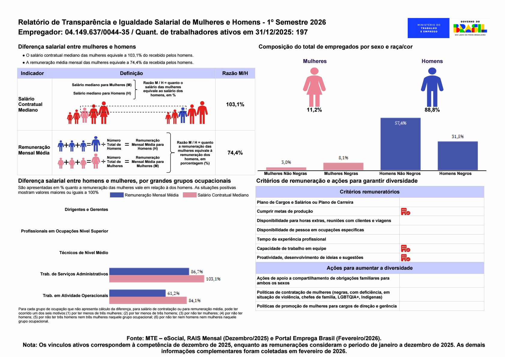 Em conformidade com essa legislação, o Grupo ABC divulga seu 1º ciclo de 2026 do Relatório de Transparência Salarial e de Critérios Remuneratórios. O material está organizado em documentos, abrangendo diversas localidades — como Alfenas, Araxá, Betim, Divinópolis, Guaxupé, Itajubá, Pouso Alegre, Uberaba e Varginha, entre outras — e apresenta as ações da empresa para assegurar equidade salarial e os critérios adotados para remuneração no ambiente de trabalho.