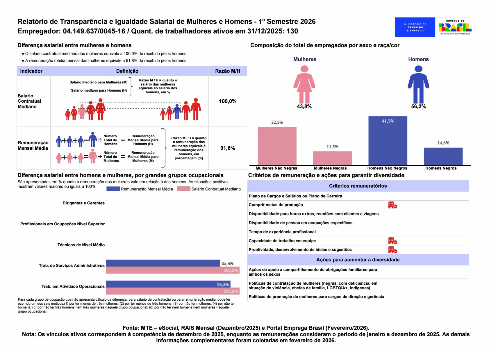 Em conformidade com essa legislação, o Grupo ABC divulga seu 1º ciclo de 2026 do Relatório de Transparência Salarial e de Critérios Remuneratórios. O material está organizado em documentos, abrangendo diversas localidades — como Alfenas, Araxá, Betim, Divinópolis, Guaxupé, Itajubá, Pouso Alegre, Uberaba e Varginha, entre outras — e apresenta as ações da empresa para assegurar equidade salarial e os critérios adotados para remuneração no ambiente de trabalho.