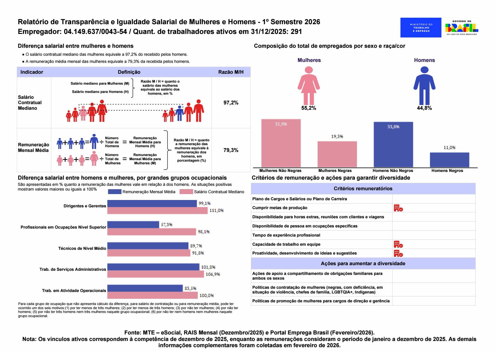 Em conformidade com essa legislação, o Grupo ABC divulga seu 1º ciclo de 2026 do Relatório de Transparência Salarial e de Critérios Remuneratórios. O material está organizado em documentos, abrangendo diversas localidades — como Alfenas, Araxá, Betim, Divinópolis, Guaxupé, Itajubá, Pouso Alegre, Uberaba e Varginha, entre outras — e apresenta as ações da empresa para assegurar equidade salarial e os critérios adotados para remuneração no ambiente de trabalho.