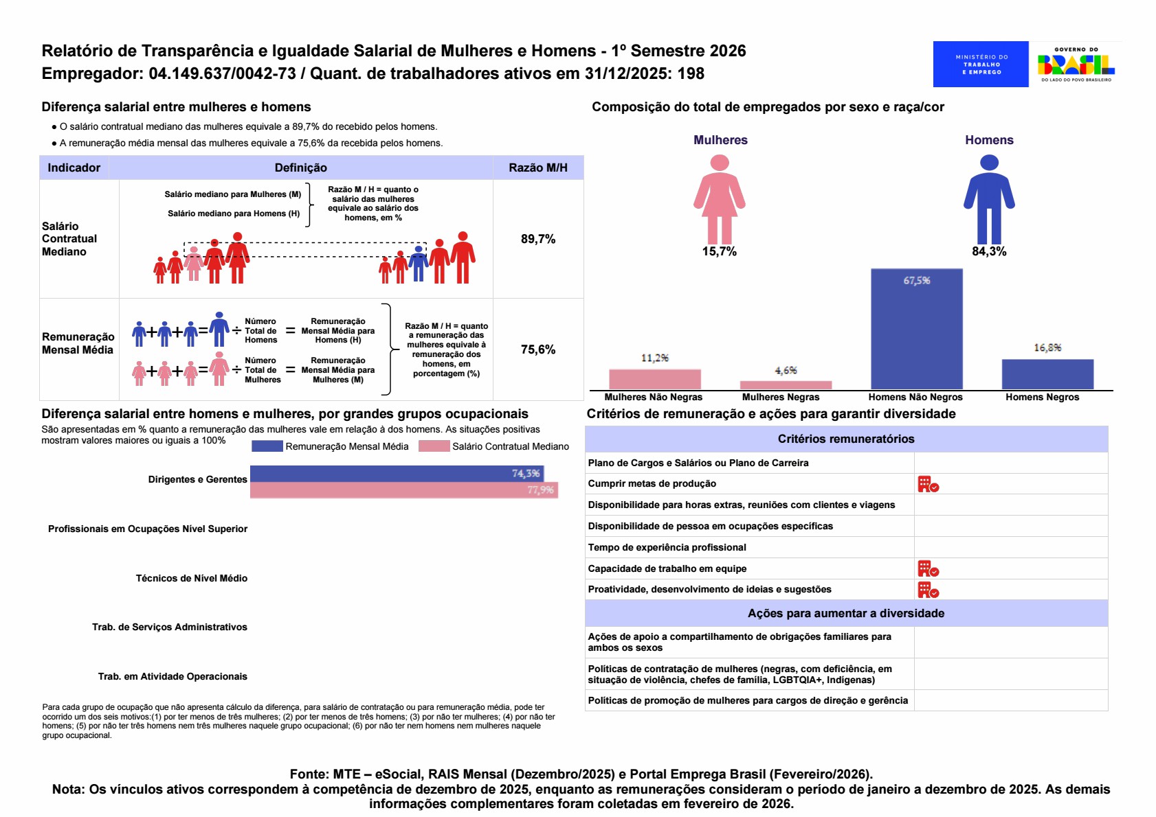 Em conformidade com essa legislação, o Grupo ABC divulga seu 1º ciclo de 2026 do Relatório de Transparência Salarial e de Critérios Remuneratórios. O material está organizado em documentos, abrangendo diversas localidades — como Alfenas, Araxá, Betim, Divinópolis, Guaxupé, Itajubá, Pouso Alegre, Uberaba e Varginha, entre outras — e apresenta as ações da empresa para assegurar equidade salarial e os critérios adotados para remuneração no ambiente de trabalho.