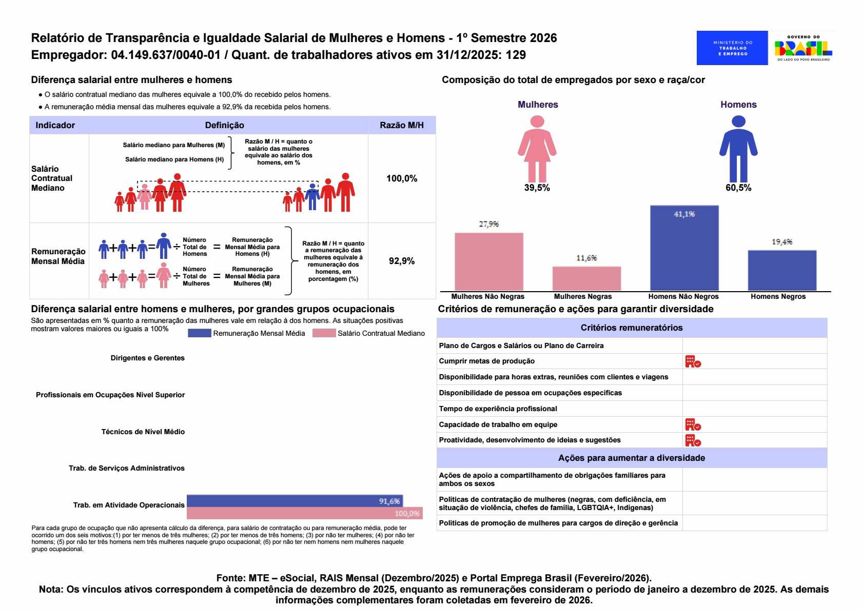 Em conformidade com essa legislação, o Grupo ABC divulga seu 1º ciclo de 2026 do Relatório de Transparência Salarial e de Critérios Remuneratórios. O material está organizado em documentos, abrangendo diversas localidades — como Alfenas, Araxá, Betim, Divinópolis, Guaxupé, Itajubá, Pouso Alegre, Uberaba e Varginha, entre outras — e apresenta as ações da empresa para assegurar equidade salarial e os critérios adotados para remuneração no ambiente de trabalho.