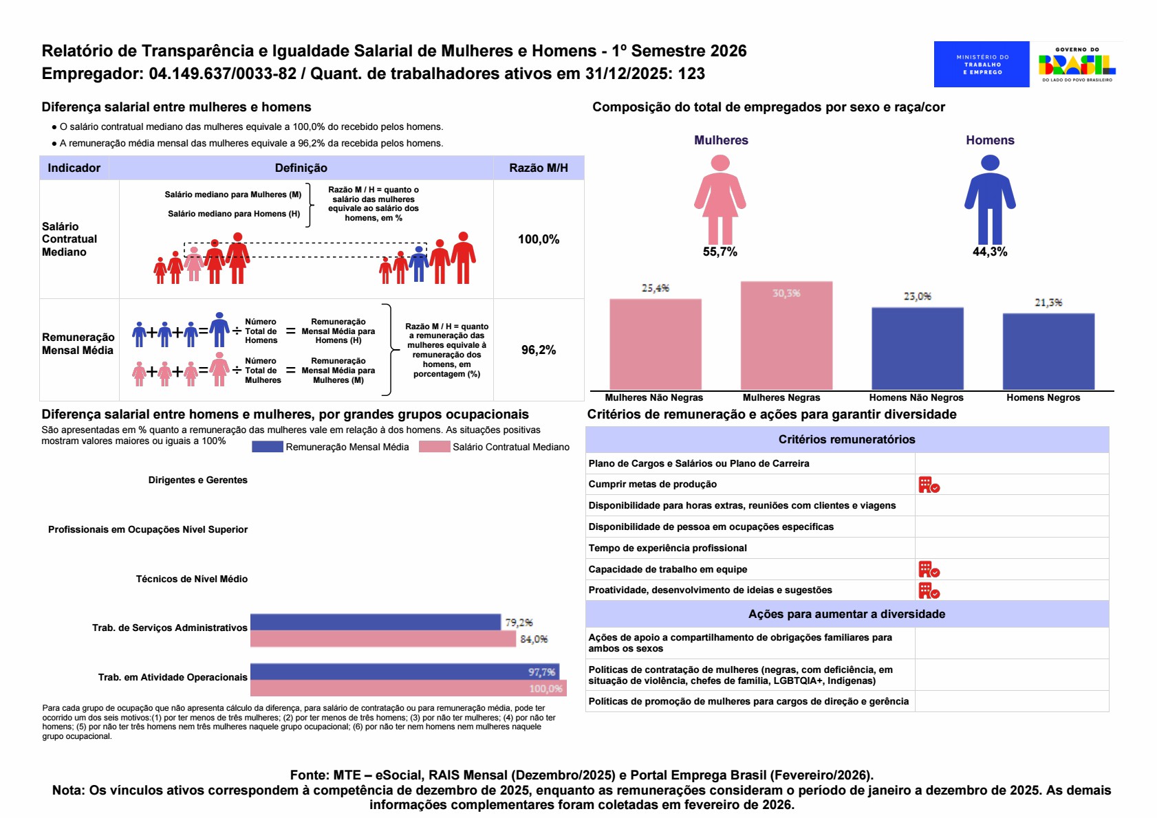Em conformidade com essa legislação, o Grupo ABC divulga seu 1º ciclo de 2026 do Relatório de Transparência Salarial e de Critérios Remuneratórios. O material está organizado em documentos, abrangendo diversas localidades — como Alfenas, Araxá, Betim, Divinópolis, Guaxupé, Itajubá, Pouso Alegre, Uberaba e Varginha, entre outras — e apresenta as ações da empresa para assegurar equidade salarial e os critérios adotados para remuneração no ambiente de trabalho.