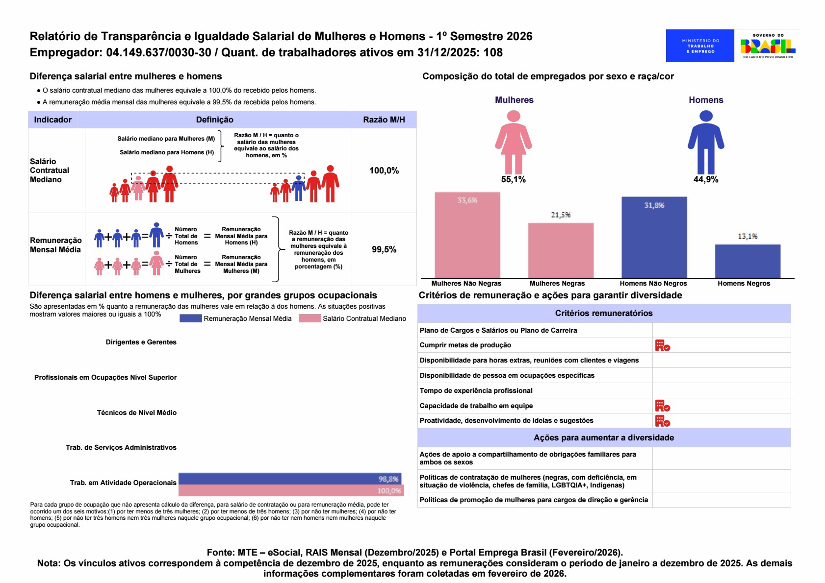 Em conformidade com essa legislação, o Grupo ABC divulga seu 1º ciclo de 2026 do Relatório de Transparência Salarial e de Critérios Remuneratórios. O material está organizado em documentos, abrangendo diversas localidades — como Alfenas, Araxá, Betim, Divinópolis, Guaxupé, Itajubá, Pouso Alegre, Uberaba e Varginha, entre outras — e apresenta as ações da empresa para assegurar equidade salarial e os critérios adotados para remuneração no ambiente de trabalho.