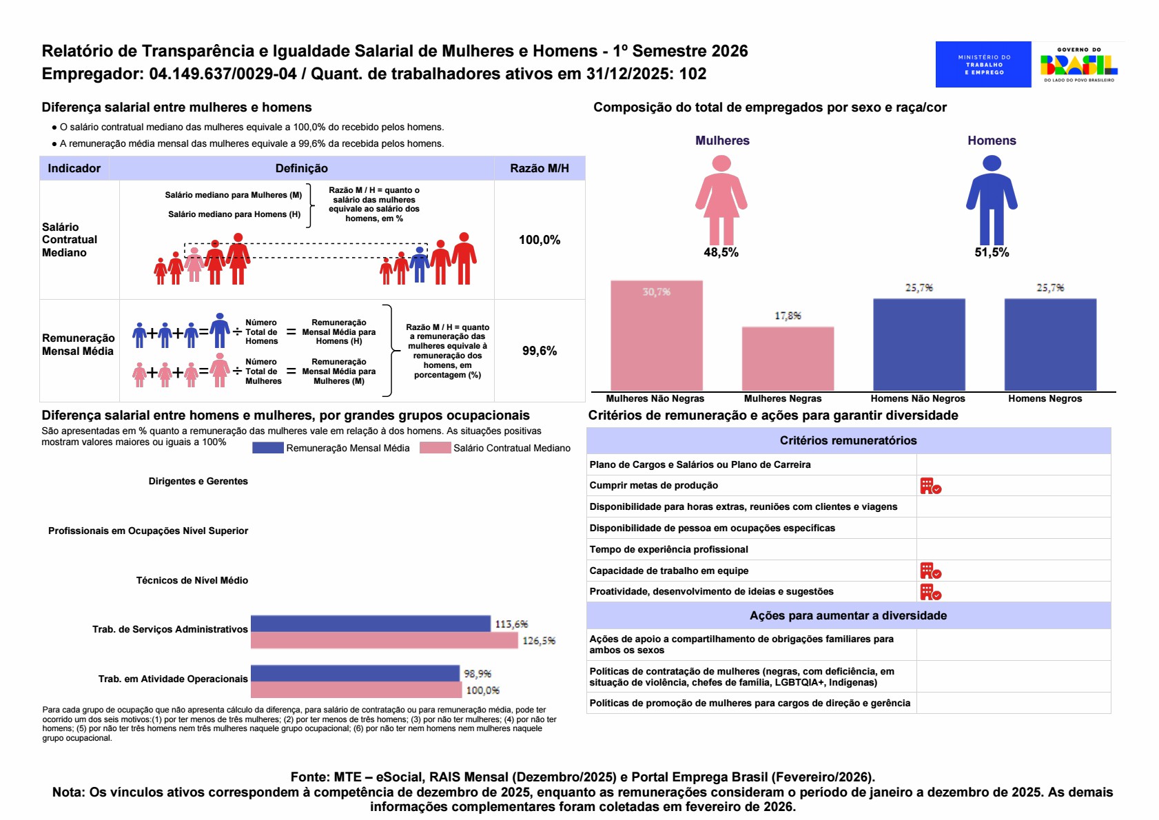 Em conformidade com essa legislação, o Grupo ABC divulga seu 1º ciclo de 2026 do Relatório de Transparência Salarial e de Critérios Remuneratórios. O material está organizado em documentos, abrangendo diversas localidades — como Alfenas, Araxá, Betim, Divinópolis, Guaxupé, Itajubá, Pouso Alegre, Uberaba e Varginha, entre outras — e apresenta as ações da empresa para assegurar equidade salarial e os critérios adotados para remuneração no ambiente de trabalho.